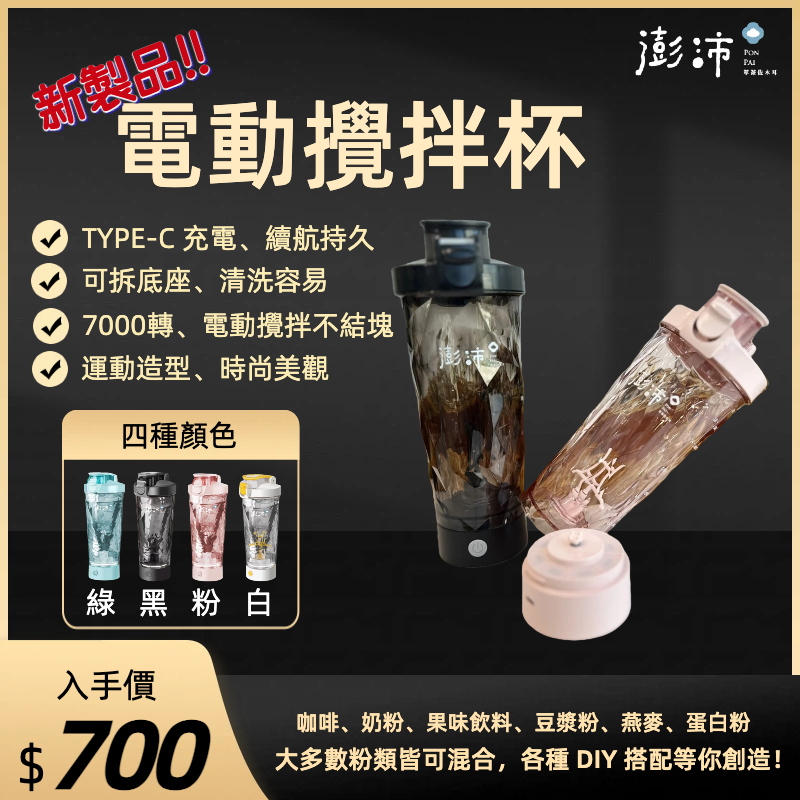 產品名稱:電動攪拌杯 容量:700 毫升 轉速:每分鐘 7000 轉 尺寸:91 × 105 × 245 毫米 充電方式:Type-C 充電線