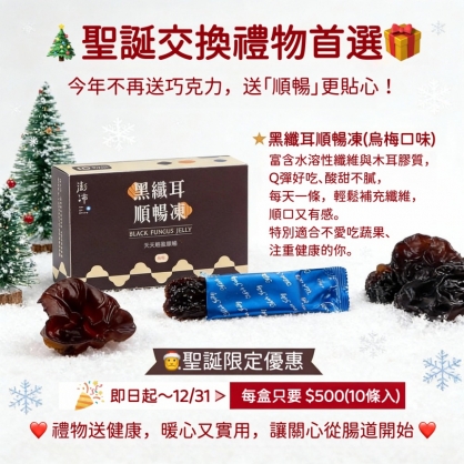 送禮不只好看,更要貼心!這次換成黑纖耳順暢凍,給大家一份酸甜Q彈、健康又方便的驚喜。 • 每盒 $500 立即帶回家。 • 10條入盒,烏梅風味,天然木耳原汁製成,補充水溶性纖維,幫助順暢、增加飽足感。 • 每日一條,搭配足量水,即可輕鬆補充纖維,是不愛吃蔬果或追求低卡生活的朋友的好幫手。