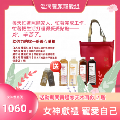 38 女神節 「溫潤養顏寵愛組」|寵愛自己・喝出光采|內含白木耳桂圓紅棗、白木耳蜂蜜、黑木耳黑糖薑汁、黑木耳桂圓紅棗