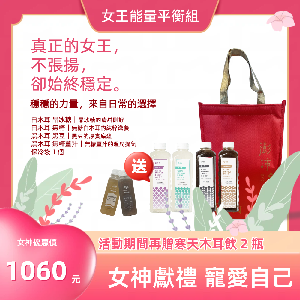 38 女神節 「女王能量平衡組」|寵愛自己・喝出光采|內含白木耳晶冰糖、白木耳無糖、黑木耳黑豆、黑木耳無糖薑汁