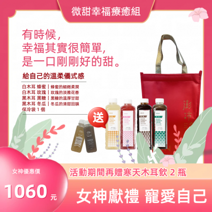 38 女神節 「微甜幸福療癒組」|寵愛自己・喝出光采|內含白木耳蜂蜜、白木耳玫瑰、黑木耳黑糖、黑木耳冬瓜