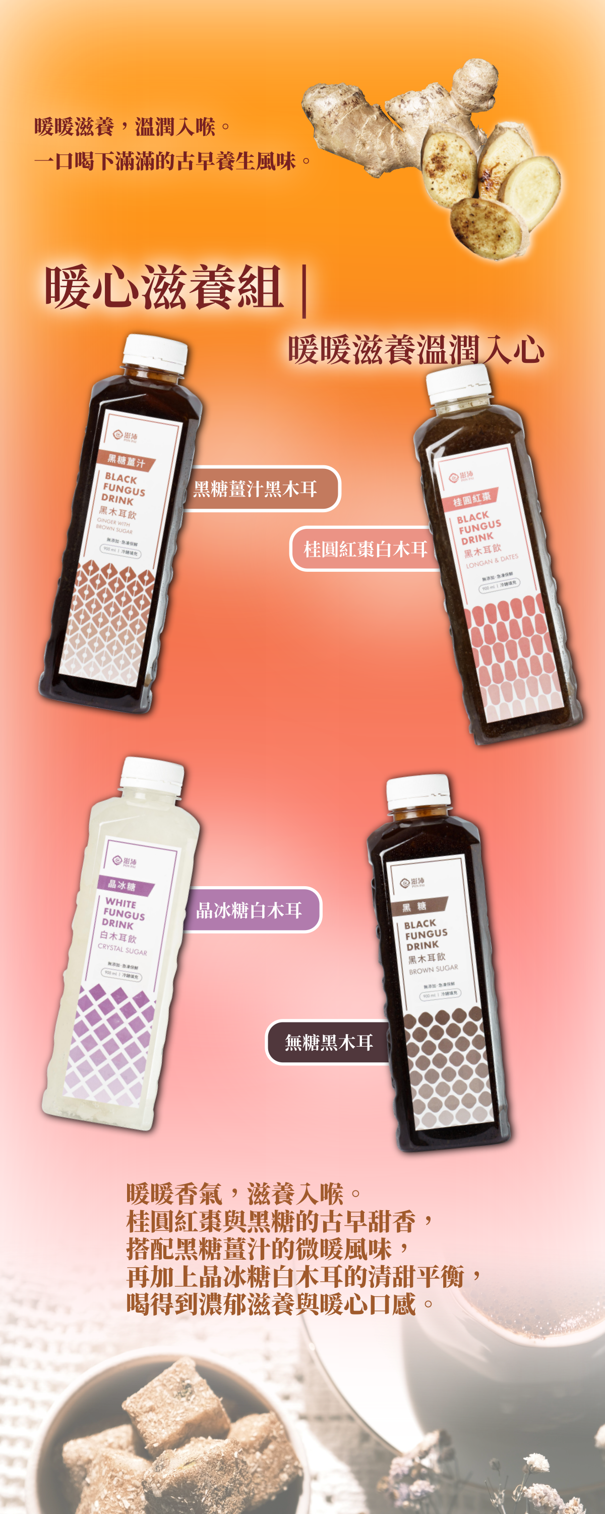 十大人氣組合「澎沛暖心滋養組」 | 暖暖滋養溫潤入心 |桂圓紅棗白木耳+晶冰糖白木耳+黑糖黑木耳+黑糖薑汁黑木耳
