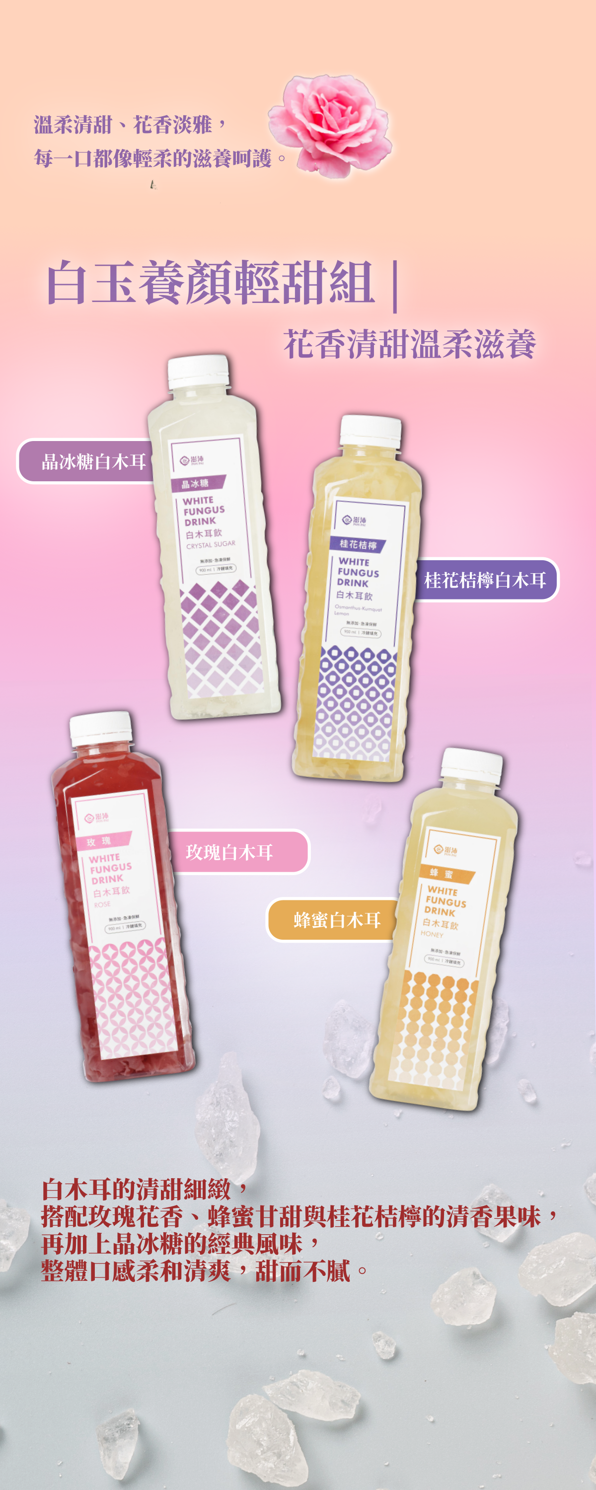 十大人氣組合「白玉養顏輕甜組」 | 花香清甜溫柔滋養 |玫瑰白木耳+蜂蜜白木耳+桂花桔檸白木耳+晶冰糖白木耳